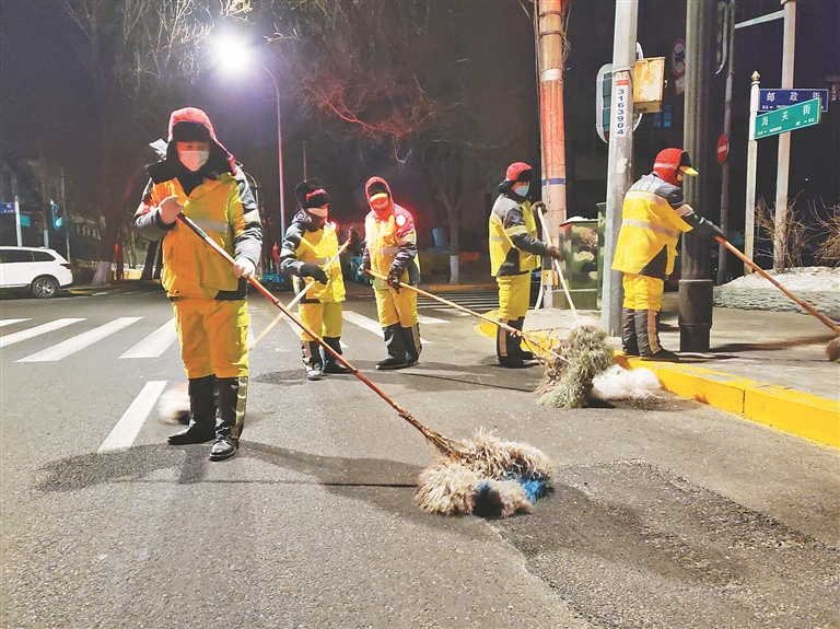 21日冬至,凌晨4时,哈尔滨市海关街与邮政街交叉口,南岗区清扫保洁二队松一小队小队长刘文亮正在和同事们一起清扫街面。