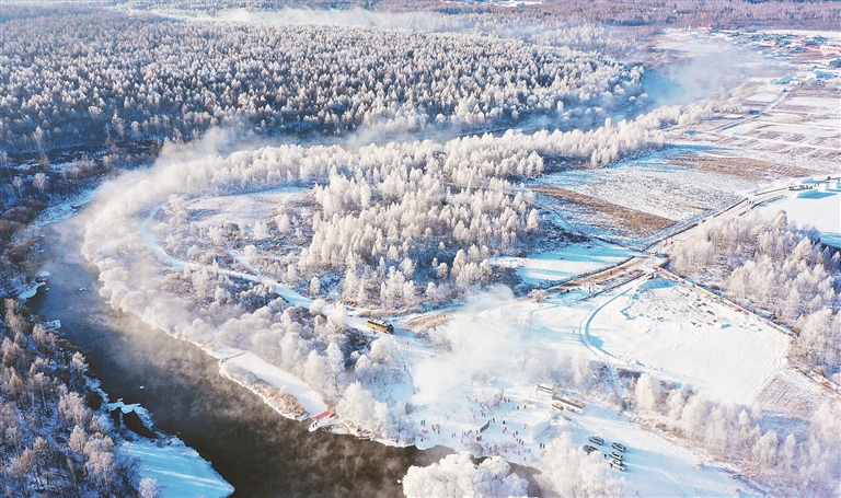 由于气温骤降,黑河市逊克县大平台雾凇景区迎来四季中最美的时光,库尔滨河上轻烟袅袅、雾气蒙蒙,岸边一草一木都仿佛在皑皑白雪中被蘸过一样,银装素裹,玉树琼枝掩映的河水蜿蜒流淌。雾凇美景吸引了全国各地游客慕名而来,一年一度的逊克雾凇冰雪节活动也随之开始。
