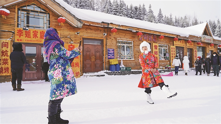 元旦小长假首日,中国雪乡景区里家家户户张灯结彩,喜庆气息扑面而来,游客穿上花棉袄拍照留念。