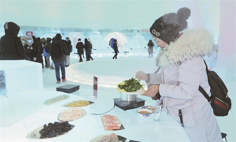 近日,哈尔滨冰雪大世界园区内的冰屋子火锅店开业。火锅店位于雪壳建筑内,桌椅都是由冰做成,屋子内的温度与室外相差无几,游客坐在冰凳子上,围着冰桌子,吃着热气腾腾的火锅,连呼“过瘾”。