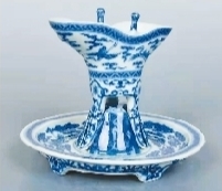 本套爵盘造型端庄隽秀,修胎精细,胎质细腻,釉面光亮。青花清雅明亮,纹样构图规整灵动,青铜器古朴瑰丽的造型和吉庆云鹤纹饰相结合。此类爵盘在清代官窑烧造档案中,被称为“青花白地江山一统爵盘”,寓意为江山永固、社稷长存、国运永昌。