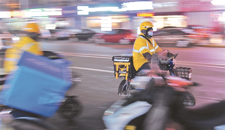 19时30分,在哈尔滨市南岗区泰山路、闽江路上,身着黄色或蓝色工服、戴着厚厚脖套面罩的外卖小哥脚步匆匆,拿到餐袋后快速启动座驾迎风而行。
