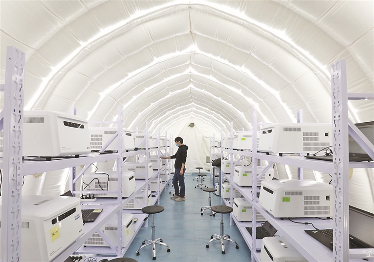 当日,日检测通量10万单管的“火眼”实验室(气膜版)经过连夜建设,在石家庄市河北体育馆网球馆亮相。目前,工作人员正在加紧安装调试设备,投入运行后每日最高可检测核酸样本量100万人份。
