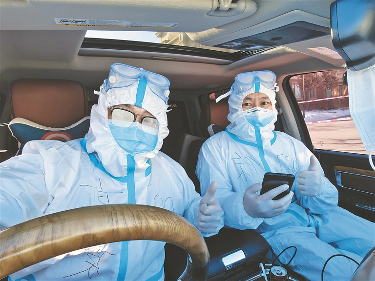 7日上午,黑河城区核酸检测正式开启。标本采集后,为保证标本时效性,4台车负责在黑河当地18个采集点进行样本转运,6台车循环飞驰在黑河和哈尔滨往返的高速上,一台车两名驾驶员轮换,人歇车不停,24小时运输耗材和标本。队员们穿着防护服带着护目镜,长时间在寒风中转运样本,不少人的眉毛、眼镜都结上了厚厚的一层冰霜。大家累了就在车上打个盹,饿了就吃点方便面和面包。所有人心中只有一个念头,就是快点、再快点!整个团队合作默契,各环节严密有序,助力核酸检测转运跑出了“加速度”。
