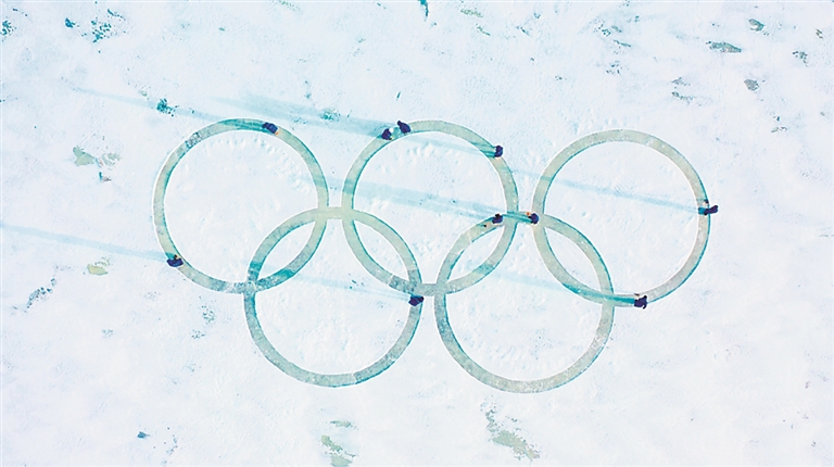 18日,雪后的松花江江面上出现了一幅长约40米、宽约20米的巨型奥运五环图案。哈尔滨松花江冰雪嘉年华负责人黄训军表示,18日下午,17名工作人员以松花江面为纸,以铁锹扫帚为笔,从定点绘制到挥锹清雪,用两个小时完成了这一图案,饱含了对明年冬奥会的美好祝愿。本报记者 刘艳摄