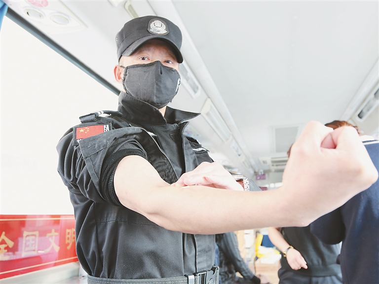 在采血车上,正在献血的黄旭东告诉记者,这是他第三次献血,能在疫情期间奉献一份爱心自己很自豪。