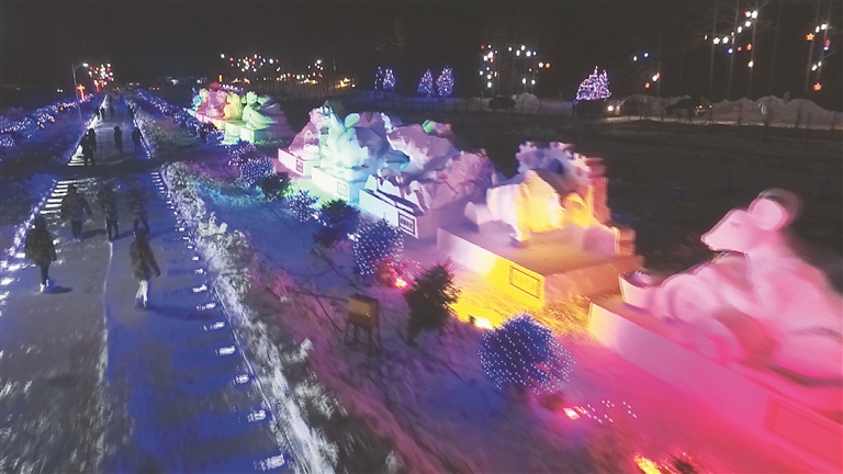 林场里的匠人,用洁白的雪,雕刻成栩栩如生的十二生肖。35米长的巨型雪凤凰,矗立在雪地中,寓意着宝泉林场展翅腾飞的美好生活。