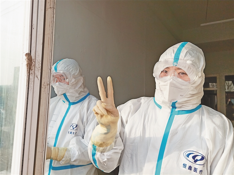 负责采样的外二科护士姚雪冻得手指有些僵硬,只能时不时地用提前粘在防护服外面的热贴暖暖手。面对记者的镜头,1994年出生的姚雪,俏皮地用僵硬的手指摆出一个胜利的手势,转身继续投入到紧张的工作中。