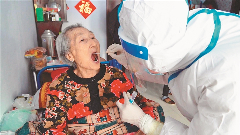 20日,风雪交加。早上5点钟,当人们还在睡梦中时,绥林医院的医护人员已经顶风冒雪,赶往支援的地点。他们穿梭忙碌在各个居民小区,为老人、婴幼儿、卧床病人等特殊群体入户核酸采样。