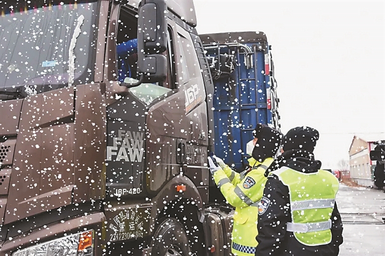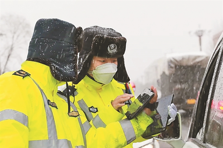 20日一大早,青冈县公安交警大队吴虹桥和同事在卡口冒着雪认真核对出入车辆信息。疫情发生以来,全警参战请战,全力配合卫健、疾控、交通运输等部门坚守一线。