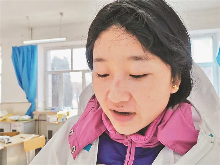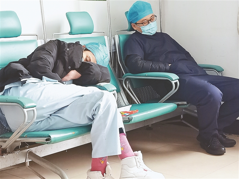 换班间隙,骨外科护士金维维正打算倚靠在角落里的椅子上抓紧休息一会,但连续几个小时的工作下来,浑身早已冻透的她突然腹痛起来,只能把头紧紧地靠在膝盖上,尽量缓解身体上的不适。