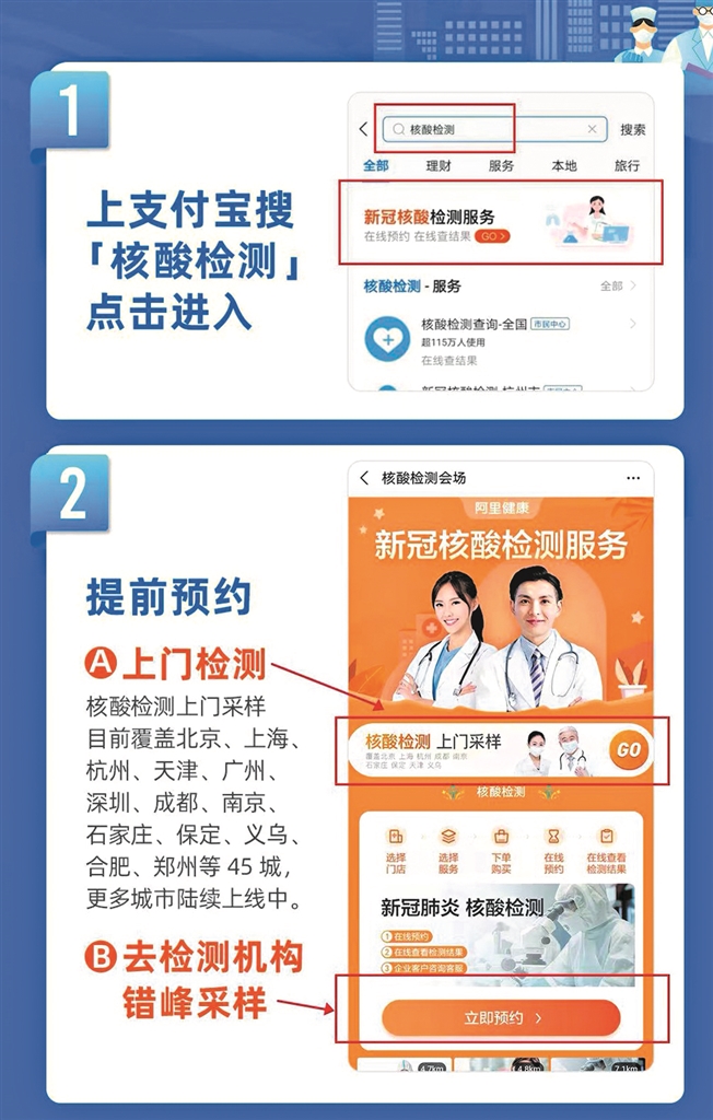 据悉,想预约核酸检测上门采样的市民可通过支付宝搜“核酸检测”,点击进入“新冠核酸检测服务”专区,即可查询全国采样点位置或附近核酸检测机构位置,进行提前预约检测,或预约上门采样。此外,上支付宝搜“疫情”进入“抗击新冠肺炎”专区,也可直达核酸检测预约页面。检测完成后,用户还可在手机上查询核酸检测证明结果。