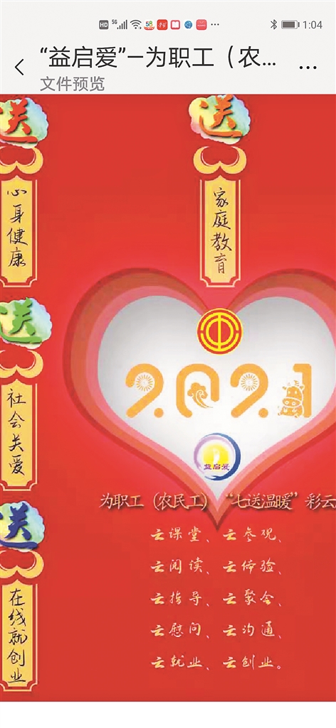 记者了解到,除了居家者自发组织的联欢会,省市工会组织和一些公益社团,也纷纷深入社区开展了以“学习、创业、家庭、法治”等等为主题的联欢、年庆活动。“居家心理防疫健康钥匙”、“居家快乐八段锦”、“居家幸福眼手操”等等课堂和活动设置,服务的就是过年不能回家的农民工。