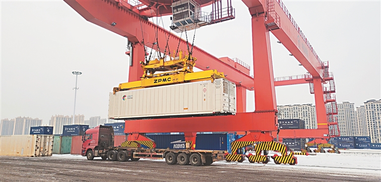 哈尔滨集装箱中心站对物资进行吊装。胡峰 杨柳摄