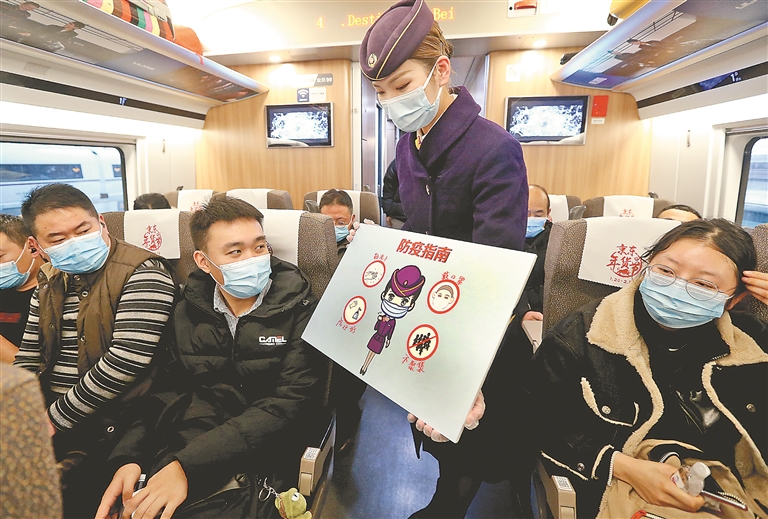 26日,乘务员在上海虹桥开往北京南的G124次列车上展示防疫指南。