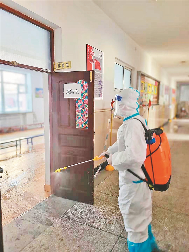 26日11时许,位于哈尔滨市道外区的哈尔滨市大方里学校一楼一间教室的乒乓球桌台上,摆放着两套齐全的防疫装备,这里马上要开始进行核酸检测之后的消杀工作。执行这次消杀任务的,是两名“00后”大学生志愿者于城事和冷俊达。