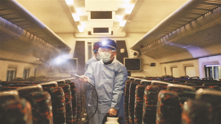 工作人员对列车车厢进行消毒。图片由中国铁路哈尔滨局集团有限公司提供