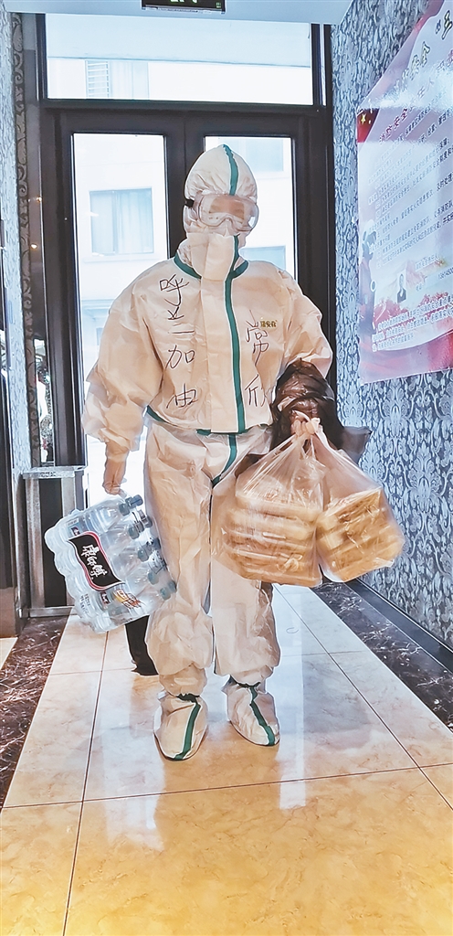 身穿防护服、戴着手套鞋套,一手拎着一提矿泉水、一手拎着18盒盒饭,记者面前这位柔弱的小姑娘,每天在四层楼之间来回跑不知多少趟,被身边人称为“金刚芭比”,她就是黑龙江农垦科技职业学院大二学生常欣。