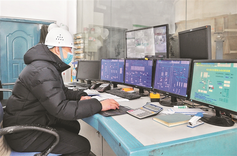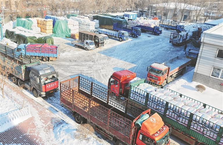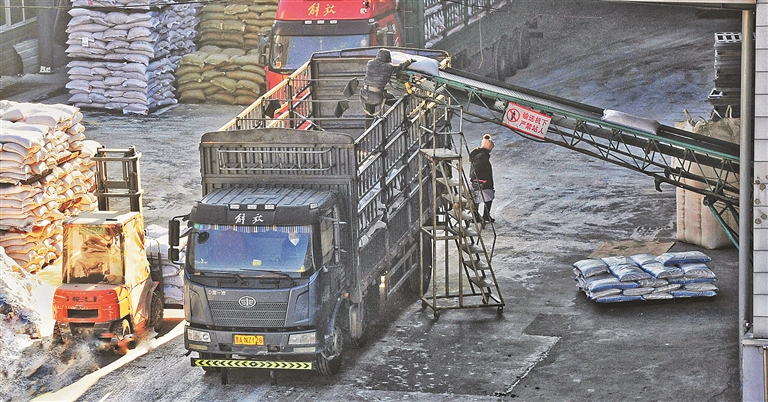 日前,记者驱车前往位于哈尔滨新区江南园区的谷实生物。刚刚接近企业,记者就被眼前数台大货车挡住了视线,差点错过企业大门。粗略数了一下,至少有20台车。走进公司厂区,记者看到整齐码放的原料堆成小山,出货口处,自动化的运货履带匀速运转着,10多台大货车正排队装货。