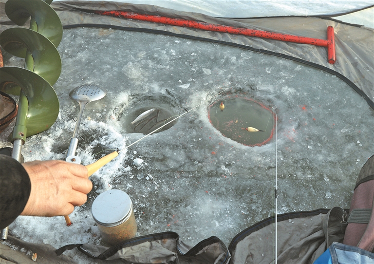 江上风大,李利就在身体周边挡上一圈塑料布,一遇大风,塑料布撑不住,李利干脆把夏天用的帐篷拿来,坐在里面钓。遇到阴天,帐篷里挺冷,李利就拿来酒精炉点起来,小小的空间马上就暖和了。脚下再踩上泡沫垫隔寒,可以舒舒服服地坐着钓上一小天。“我算是哈尔滨最早的冰钓者。”李利说。