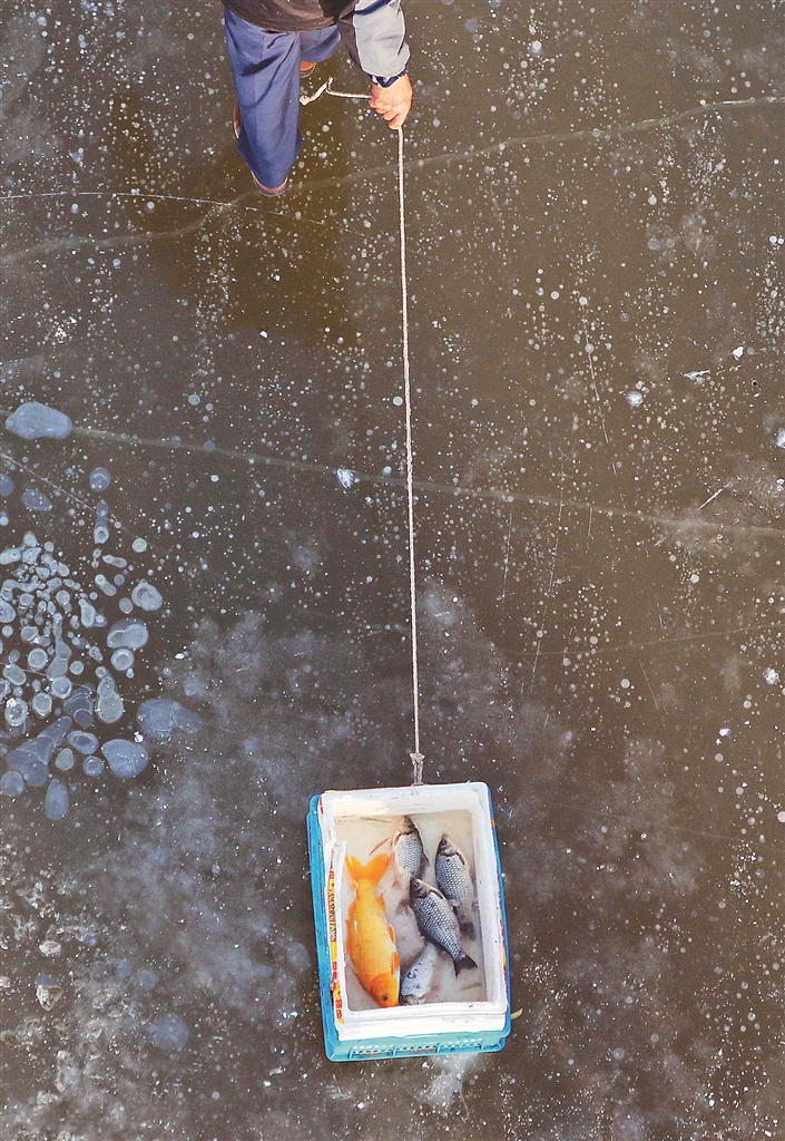 每到冰锁大江的时节,哈尔滨市滨北桥下的松花江上、长岭湖湖面,就会出现一顶顶颜色各异的小帐篷。里面的人坐在小马扎上,拿着小鱼竿,守着一个或多个小冰眼,津津有味地垂钓着。