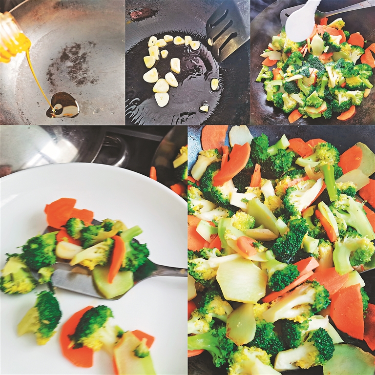 第三步:锅里热油,放入花椒粒、蒜片(或蒜末)爆香,依次放入西兰花、胡萝卜,加盐迅速翻炒出锅。