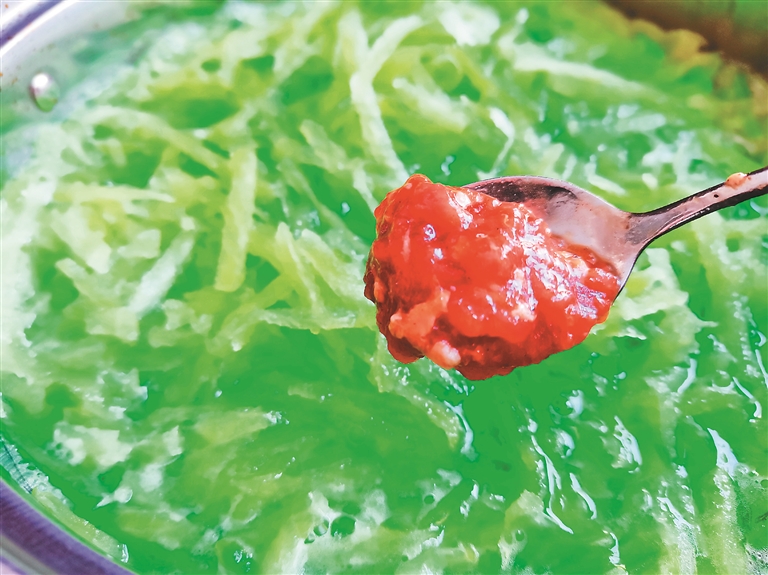 第三步:将擦好的绿萝卜丝放入锅中,加水至没过萝卜丝即可。