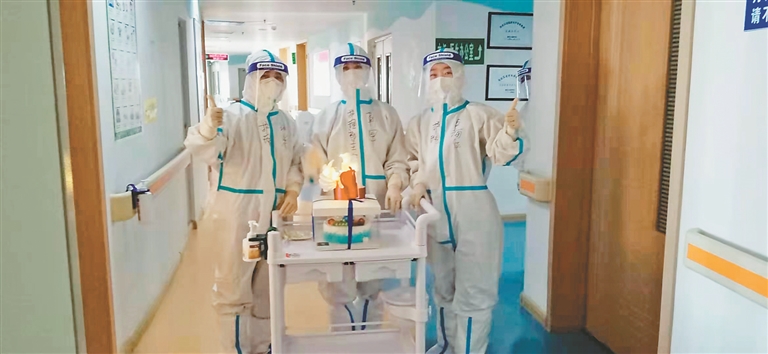 上午11时许,结束了查房工作的王希斌、儿三科主任隋威、护理部副主任靳军、系总护士长卢海侠和孙岩等医护人员推着特意为安安订制的“多啦A梦”蛋糕、生日面,以及他喜欢吃的饺子走进了病房,安安看到护士阿姨们穿着厚重的防护服拿着礼物走进房间的时候,眼神里流露出惊讶与喜悦。