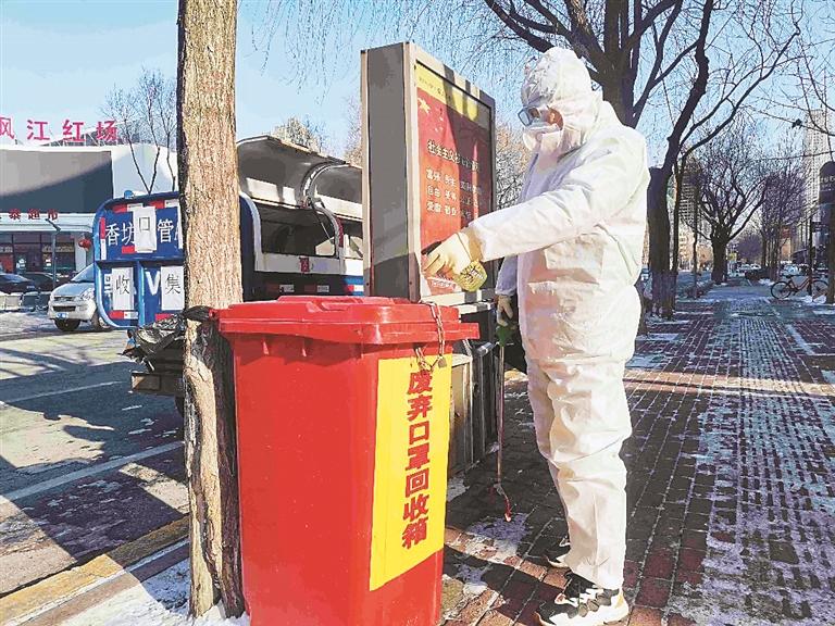 近日,为疫情防控需要,几千个标有“废弃口罩回收”字样的垃圾桶亮相哈尔滨市街头。为保障回收桶内的废弃口罩得到妥善处理,日前,哈尔滨市香坊区城管局成立了一支“废弃口罩回收”突击队。面对更高的暴露感染风险,15名队员自愿报名上岗,每天巡遍全区千余个点位,回收处理几十斤废弃口罩。