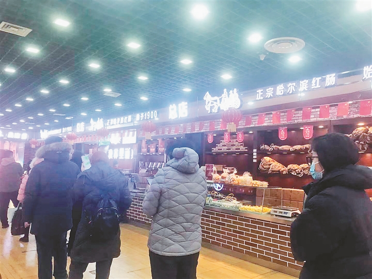 日前,记者来到哈尔滨市秋林商厦负一层的秋林里道斯专柜前看到,这里已排起了长长的队伍,让人意外的是,队伍里有不少年轻的面孔。经过门前的扫码、测温后,95后的付含欣排在了队伍后面。家在四川的付含欣已经在哈尔滨工作两年了,但不回家过年还是头一次。她说,去年回家时捎的就是里道斯红肠,家里人都说好吃。今年因为疫情和工作的原因,她选择在哈过年。给爸爸妈妈寄点什么礼物呢,她第一个就想到了里道斯红肠,因为这代表着哈尔滨的百年老字号,是她第二故乡的味道。本来也可以在网上购买,但她觉得来排队买最新鲜的,才算对父母尽一份心,也能感受一下年味儿。