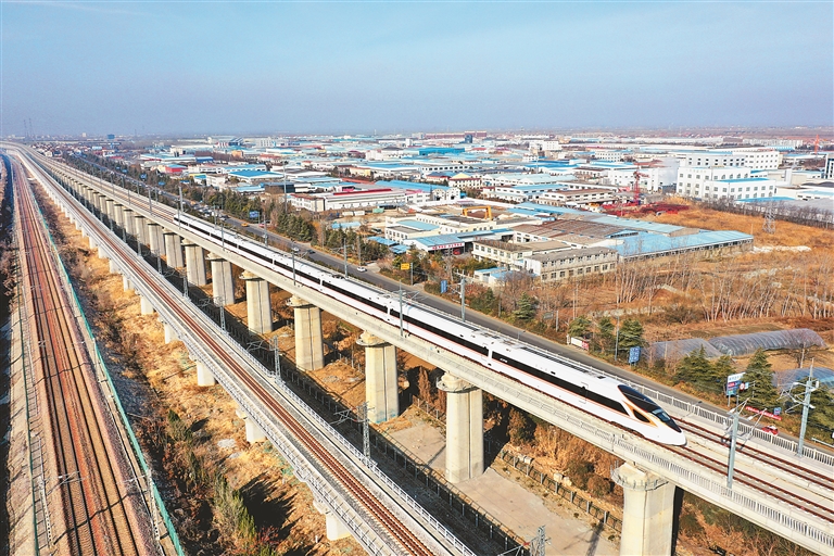 从连云港站首发徐州的G8308次“复兴号”高铁列车驶进连云港市海州区段(无人机照片)。 新华社发