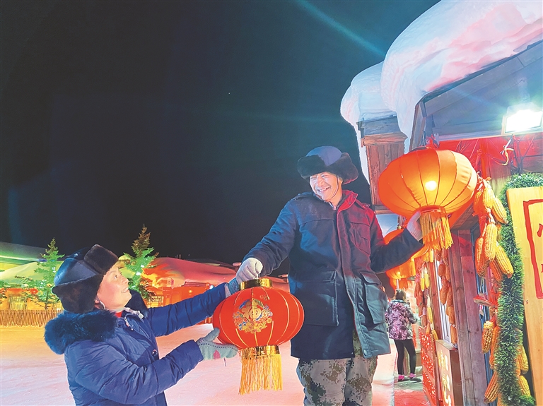 8日,国网牡丹江供电公司大海林林业供电所巡线员周振玖和妻子帮助雪乡景区用户接电悬挂大红灯笼。