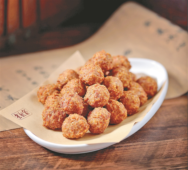 2、丸子馅入四成油温中炸至表皮发脆,捞出轻轻敲打,然后入油复炸至滋滋发声时捞起装盘上桌,外酥里嫩。