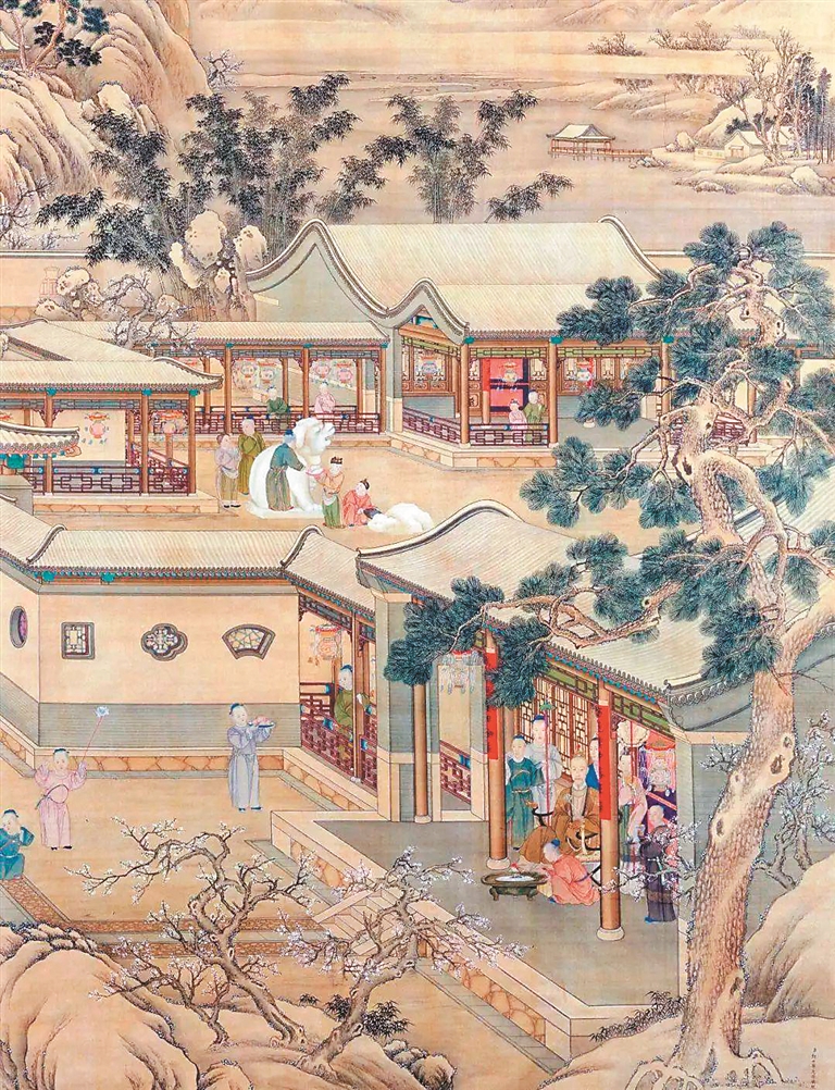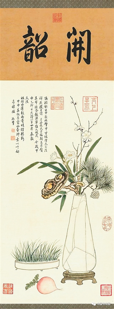 清代每逢新春,宫廷画师们都要呈交《岁朝图》,以供皇室春节期间装饰点缀之需;皇亲贵胄、朝廷命官也以进画的形式,向皇帝恭贺新禧。甚至皇帝本人也会举办“开笔式”,率先绘制《岁朝图》,表达四海升平、风调雨顺的美好希冀。乾隆皇帝有数十幅这一题材的作品传世,并题有吉祥诗句,多钤“天地一家春”朱印一方。意大利传教士郎世宁除画有大量花卉与器物组合的清供图,还奉旨绘制尺幅巨大的《乾隆帝岁朝行乐图》,后宫庭园当中种植着青青翠竹、傲雪的梅花,陈设着怒放的盆花,摆放着博古彝器的架子。乾隆皇帝手持如意端坐在交椅上,目光投向怀里的小皇子,流露出慈祥的父爱。稍年长的子女们在旁侍立,一个皇子向他敬献寿桃,还有皇子在放爆竹,处处展现出其乐融融的皇室家庆场景。