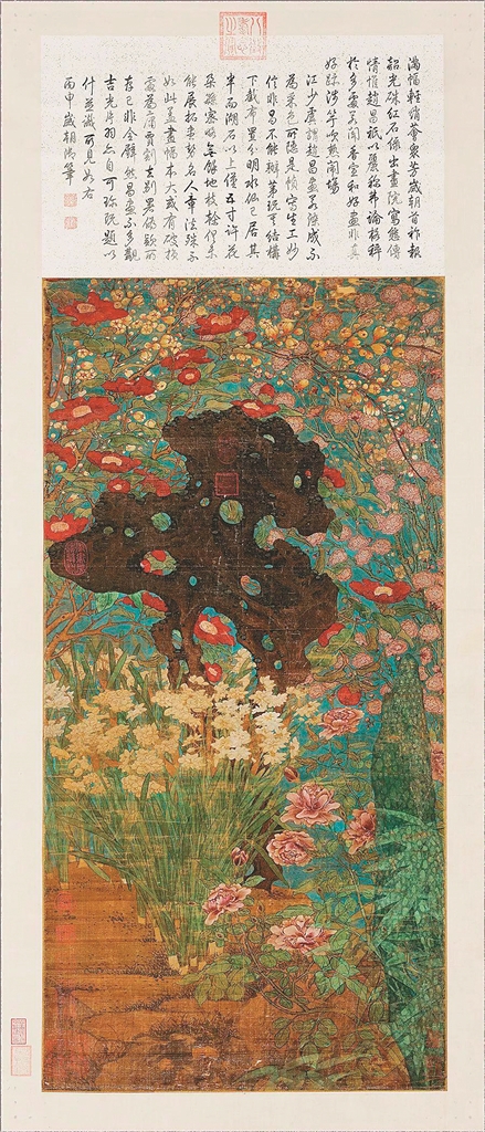 今天能够见到这一题材最早的作品是北宋徽宗年间宫廷画家赵昌所绘,现藏于台北故宫博物院的《岁朝图》。严格来说这是一幅“年画”,画面以石青填底,鲜艳明快、富丽堂皇,极具装饰效果。以朱砂、白粉、胭脂、石绿等色彩描绘了梅花、水仙、茶花、长春花及湖石。花团锦簇,铺天盖地,不留空白,浓艳的色彩,繁密的构图,营造出一种绮丽而热烈的氛围。