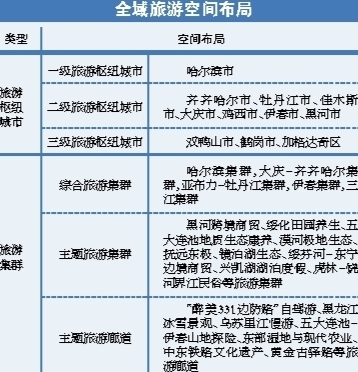 ◆实施《黑龙江省全域旅游发展总体规划(2020—2030年)》,统筹旅游资源、交通条件和功能定位,科学规划布局旅游枢纽城市、主题旅游廊道、核心景区,形成各具特色的全域旅游发展新格局。