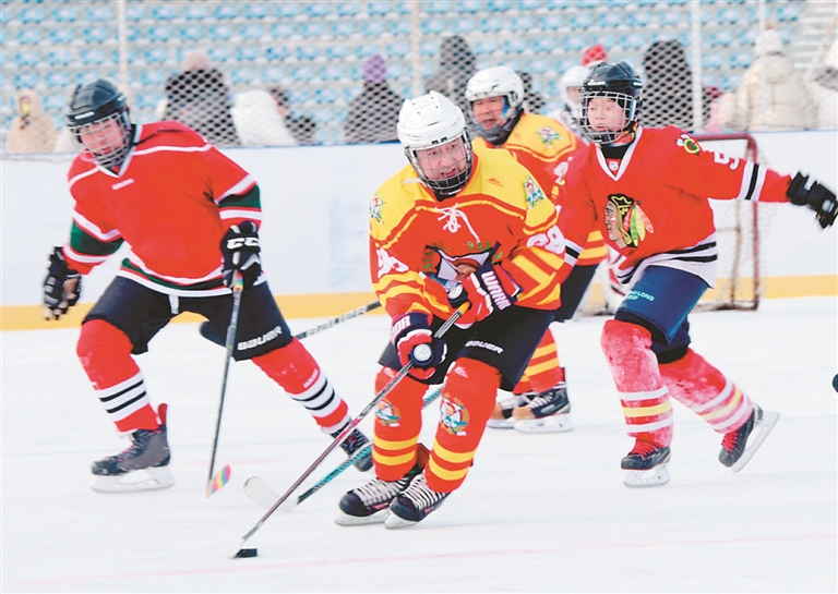 黑河市青少年业余体校冰球队与黑河市勇士冰球队,在市全民健身中心户外冰场进行了冰上实战训练课。勇士队平均年龄55岁,其中最大的66岁;青少年队最大13岁,最小8岁。