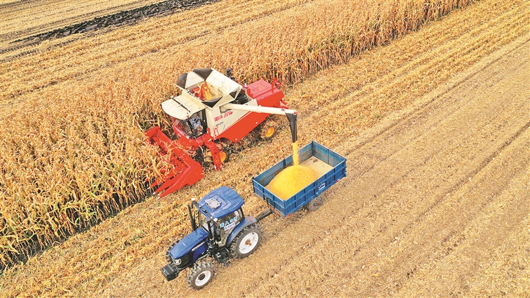 北大荒集团建三江分公司七星农场有限公司无人化农场玉米收割示范作业。 本报记者 吴树江摄