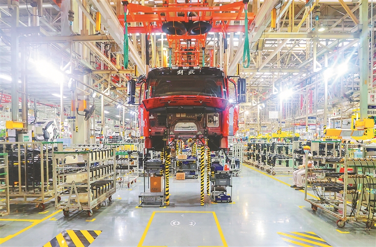 一汽解放总装车间,工人们在装配解放重卡。《吉林日报》记者 石雷摄