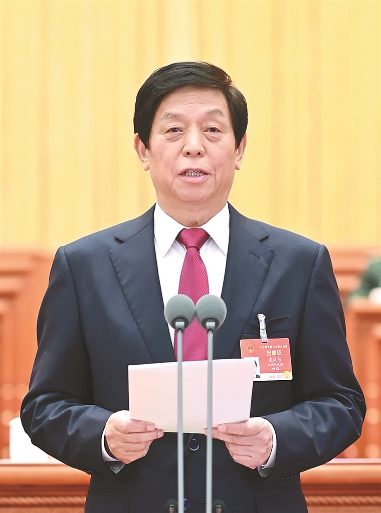 大会主席团常务主席、执行主席栗战书主持闭幕会并发表讲话。 新华社记者 李学仁摄