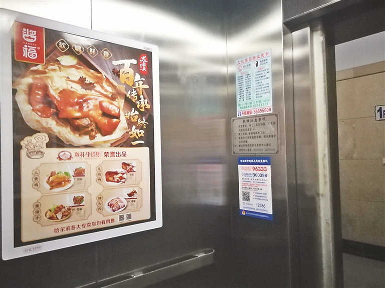 秋林里道斯在楼宇电梯中做宣传。 本报记者 黄春英摄