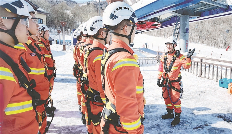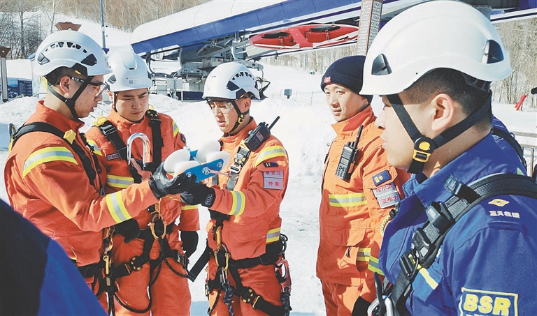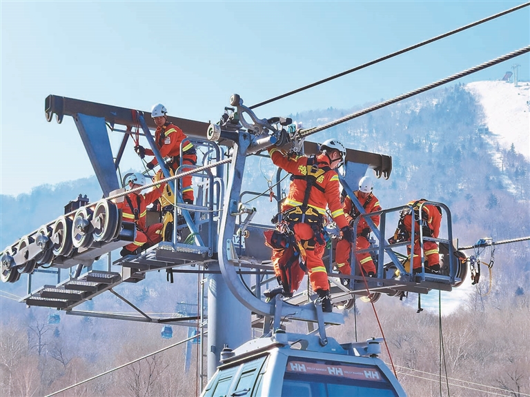 “铃铃铃……”电话铃声急促响起,“亚布力雪场发生切轴机械故障,导致A索道停运,80名游客被困在吊椅内,现请求增援。”“龙威2021-1”黑龙江省高空索道故障应急救援演练日前在亚布力雪场举行。
