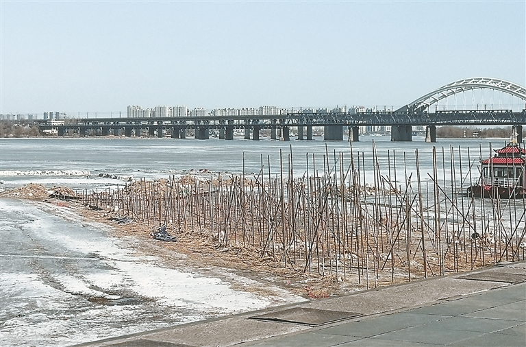 17日,哈尔滨市松花江面上,百米冰滑梯拆除后遗留的残骸破坏了江面风景。现场,数十根钢管立在冰面上,草席子、塑料袋以及一些垃圾堆得到处都是,如不及时清理,它们将随着冰层融化落入江水中。