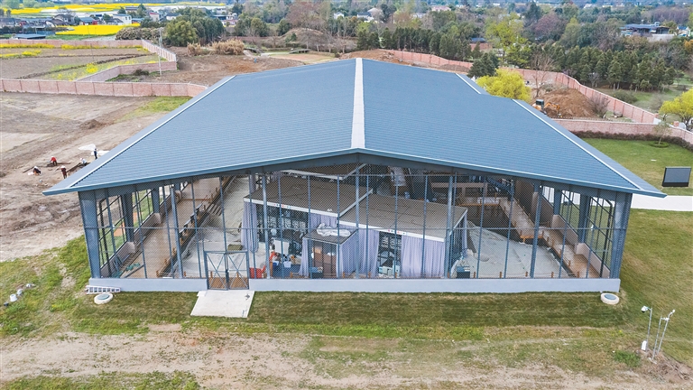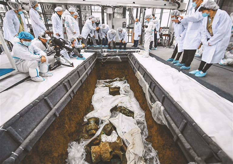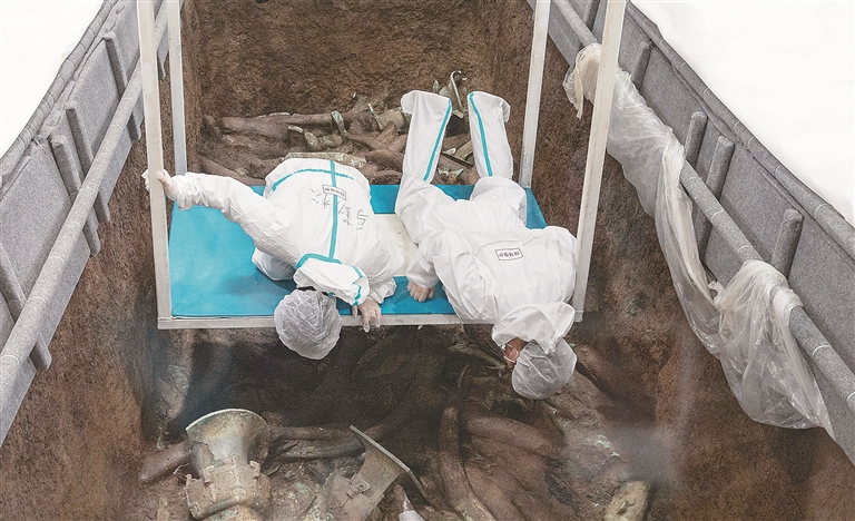 如今的发掘现场,被大跨度钢结构大棚覆盖,里面数个通透的玻璃房子将新发现的“祭祀坑”罩住。这个装满各类设备的考古“发掘舱”可以控制温度、湿度,让人惊叹不已。