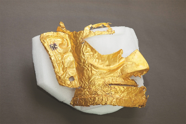 这是三星堆遗址考古发掘现场5号“祭祀坑”出土的残缺的金面具。 新华社记者 沈伯韩摄
