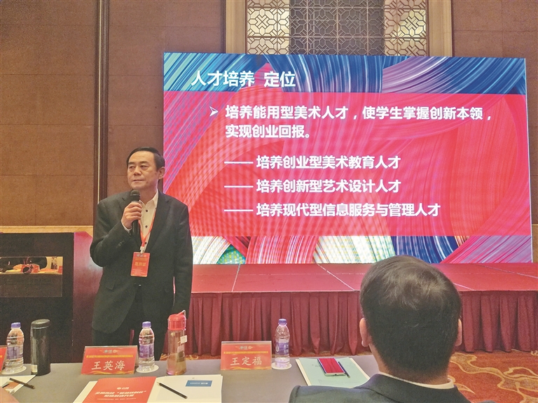 “我们学院在新时代的人才培养定位是:培养能用型美术人才,使学生掌握创新本领,实现创业回报……”2021年3月,由国家教育部高教司指导、全国大学生创新创业实践联盟主办的“第三届全国大学生创新创业实践联盟年会暨第四届双创实践新技术高峰论坛”在浙江省杭州市举行,黑龙江三江美术职业学院理事长、院长王英海受主办方邀请,在论坛上发表了题为《创新改变世界,创业成就梦想》的报告。在25分钟的时间里,与会专家学者多次以热烈的掌声表达了对报告内容的认同与赞许。