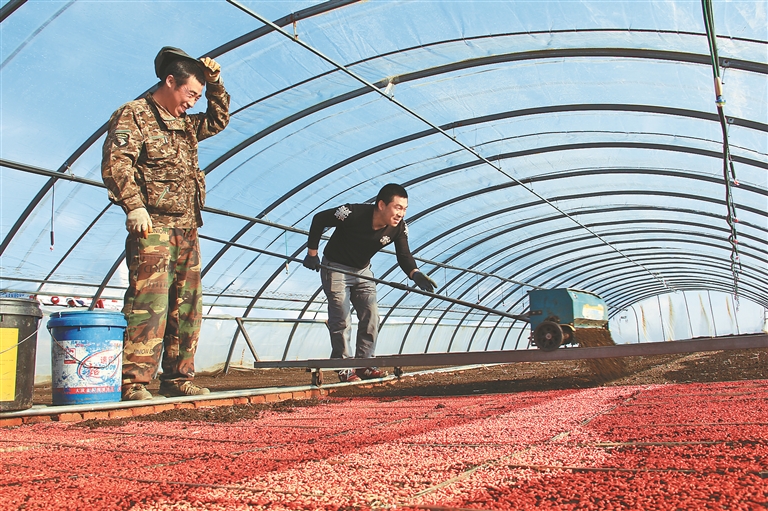在同义镇水稻种植合作育苗大棚里,合作社社员抢抓晴好天气开始水稻育秧。 张迪 本报记者 姚建平摄