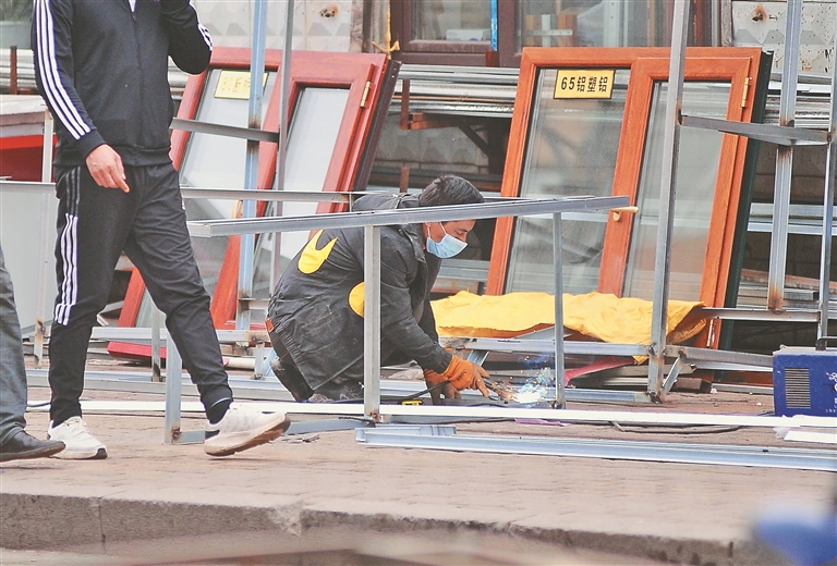 近日,记者来到现场采访。刚刚走进香坊区轴承街便听到远处传来的“滋滋……”的噪音。人行道上,一名工人正在用电锯切割金属管材,之后将这些切割好的材料焊接在一起,现场火花四处崩溅,有毒烟尘飘散,行人走到这里赶紧绕行。其周边堆放着铁架、塑钢、电锯、焊枪等大量物件,堵塞了盲道,占据人行道,本来就不宽的道路只留下不足一米宽空间供行人通行。