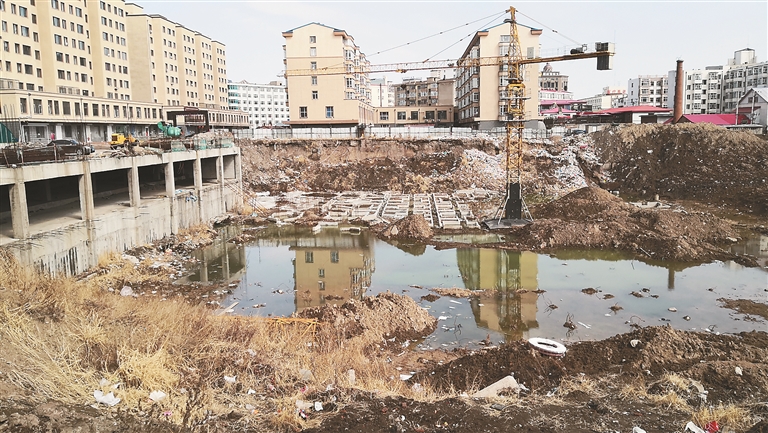记者的疑惑很快就有了答案,眼前这个大坑长度和宽度都超过百米,大约有10多米深。坑的周围几乎都是生活垃圾和居民扔的废品。坑里都是青绿色的积水。周边还有几栋尚未完成拆迁的楼体。在大坑中心位置有个塔吊,下面还有尚未完成的地基以及刚刚施工一半的地库。