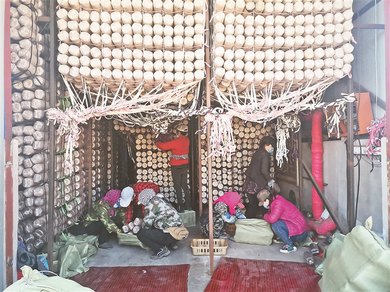 养菌室里正是丰收的时候,一串串圆柱形的菌包如同帷幔一般层层叠叠。养菌室门口,工人们正在麻利地给成熟的菌包装袋扎口。